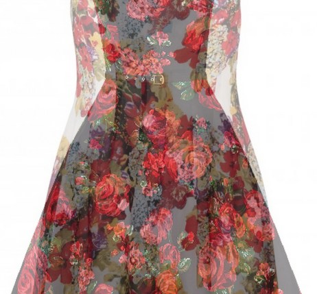 Hon har blommig klänning och en rosett i håret.